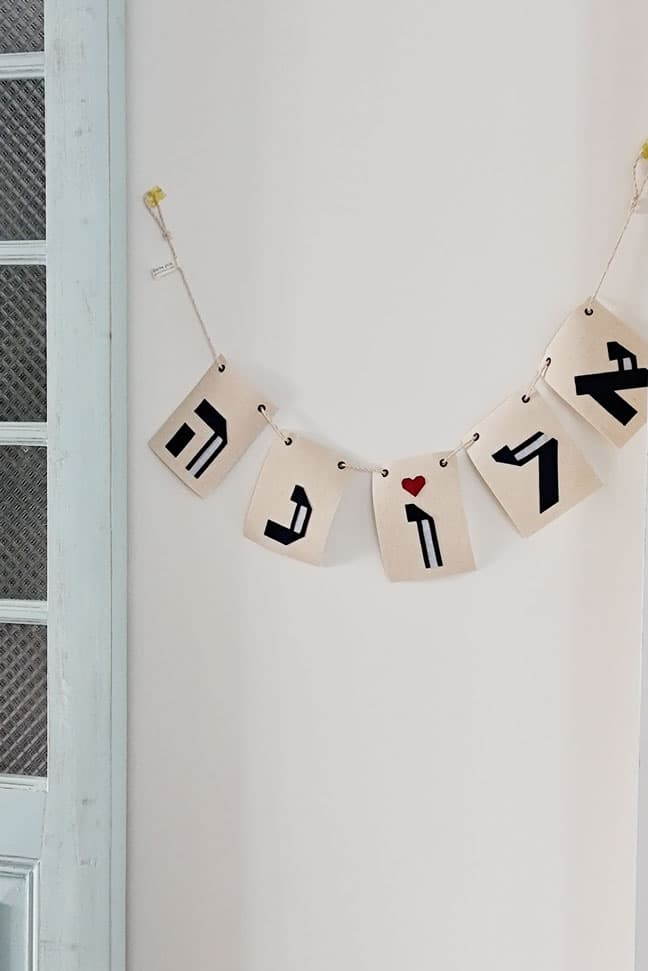 אותיות מעוצבות בשפת האוריגמי מבדי כותנה לתלייה כשרשרת מעוצבת בכניסה לחדר, על הדלת או ליד המיטה.