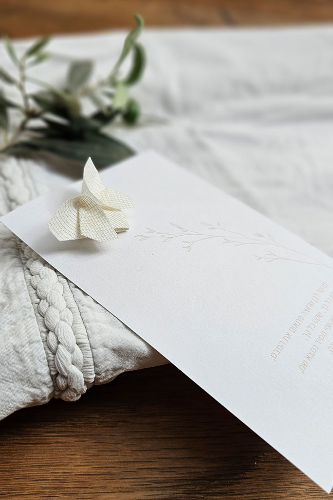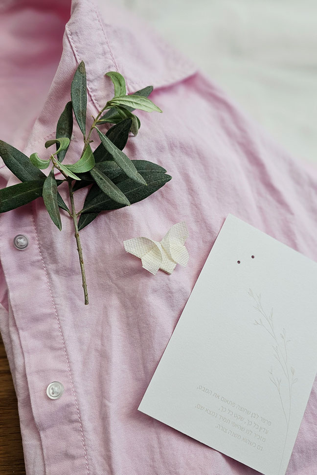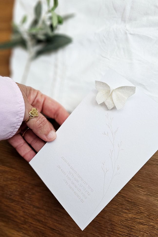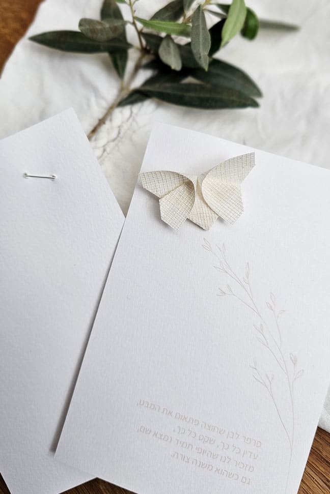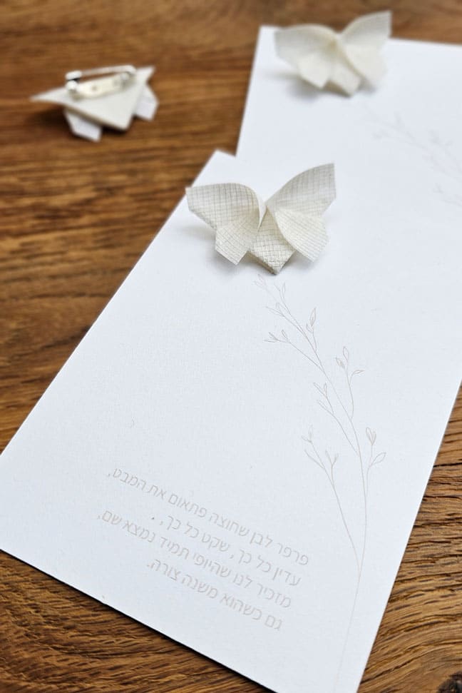 גלויית הנחמה מודפסת על נייר פבריאנו 220 גרם משובח, ונושאת סיכת פרפר לבנה שקופלה בעבודת יד מטקסטיל רשת בטכניקת אוריגמי.