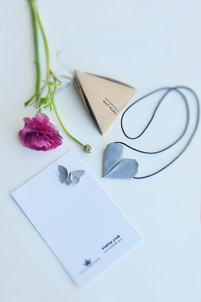 מארז מתנה חגיגי ומיוחד ובו שרשרת לב וסיכת לב תואמת לבגד בהשראת אומנות האוריגמי היפנית.