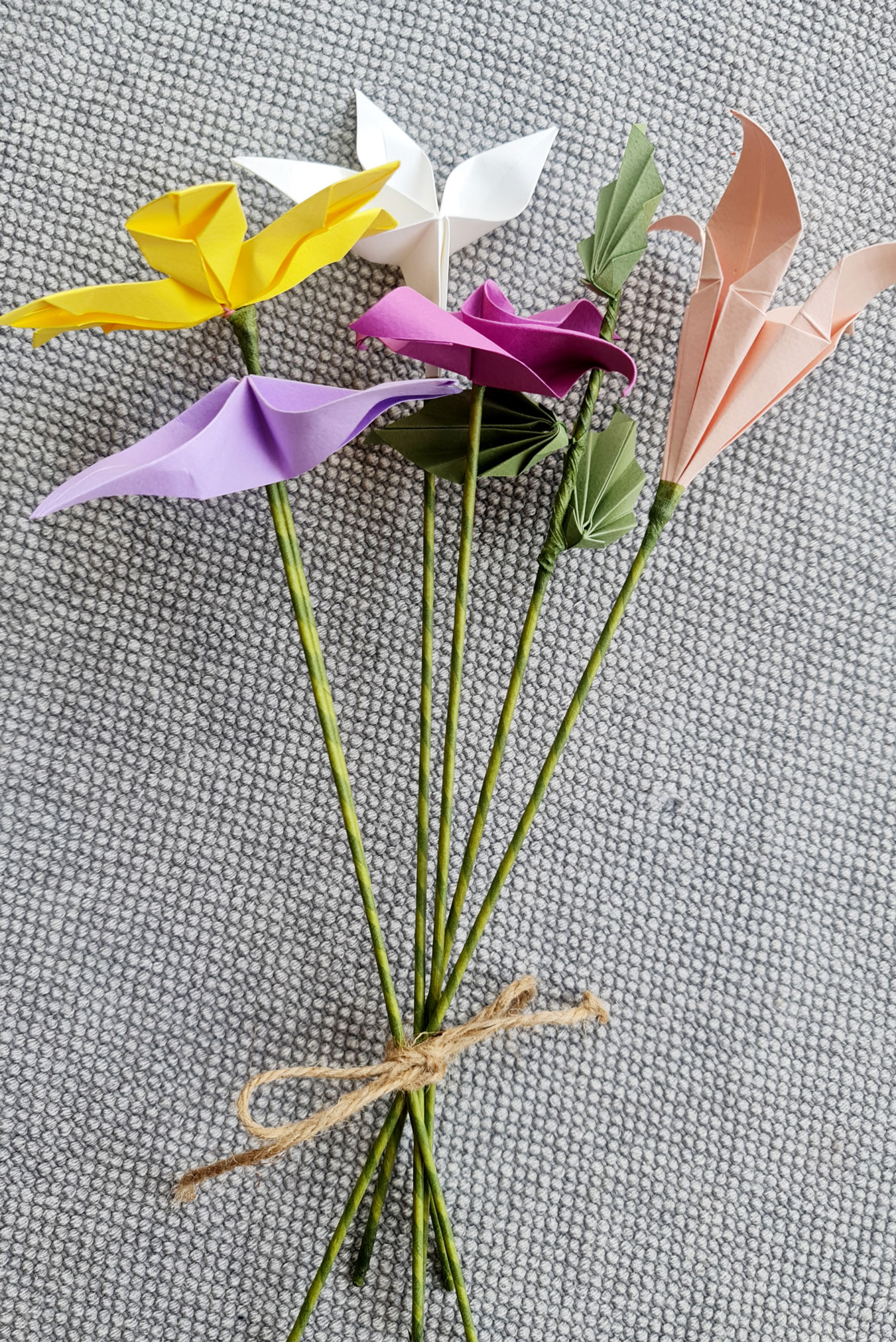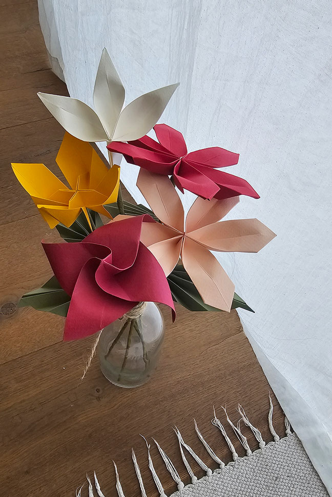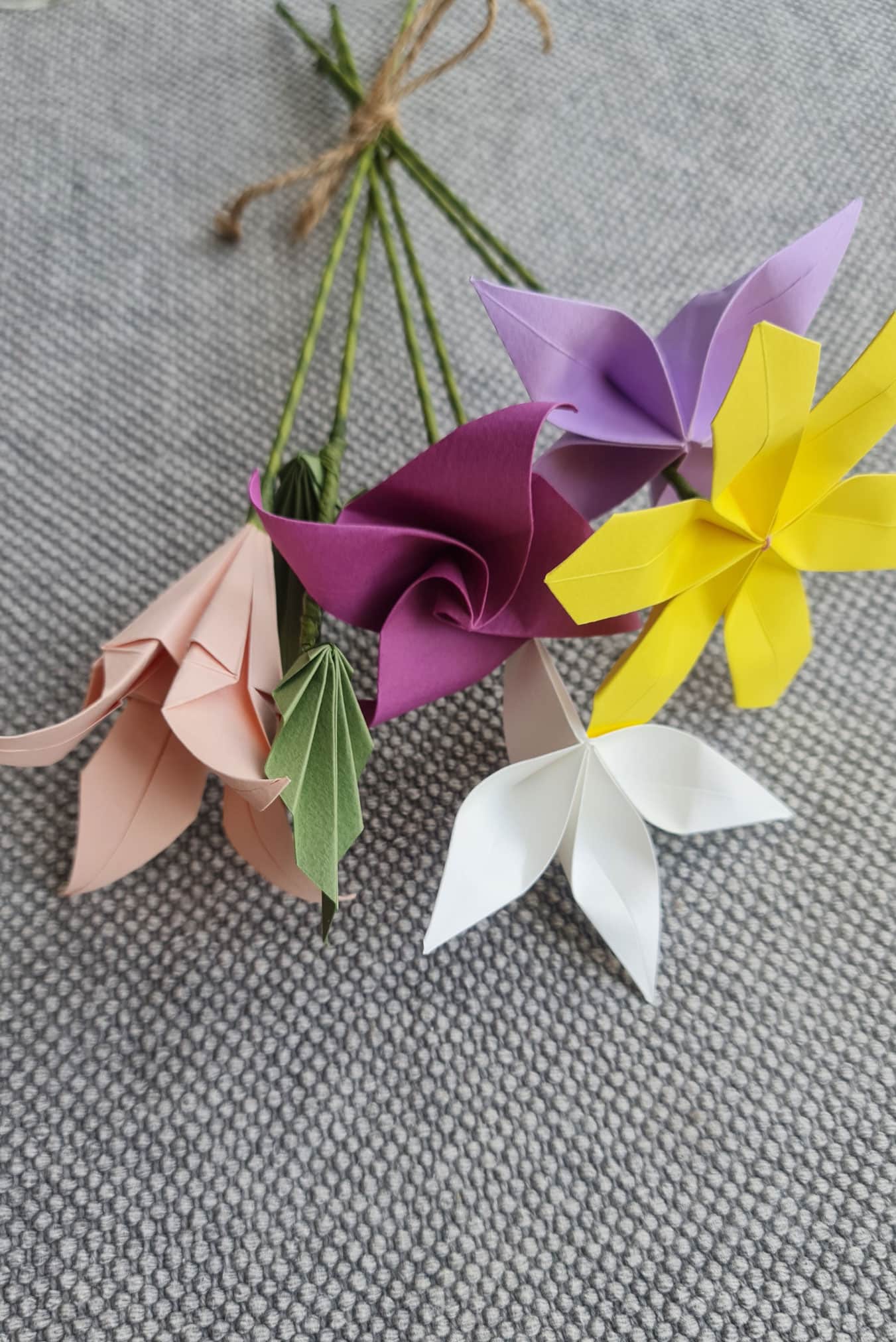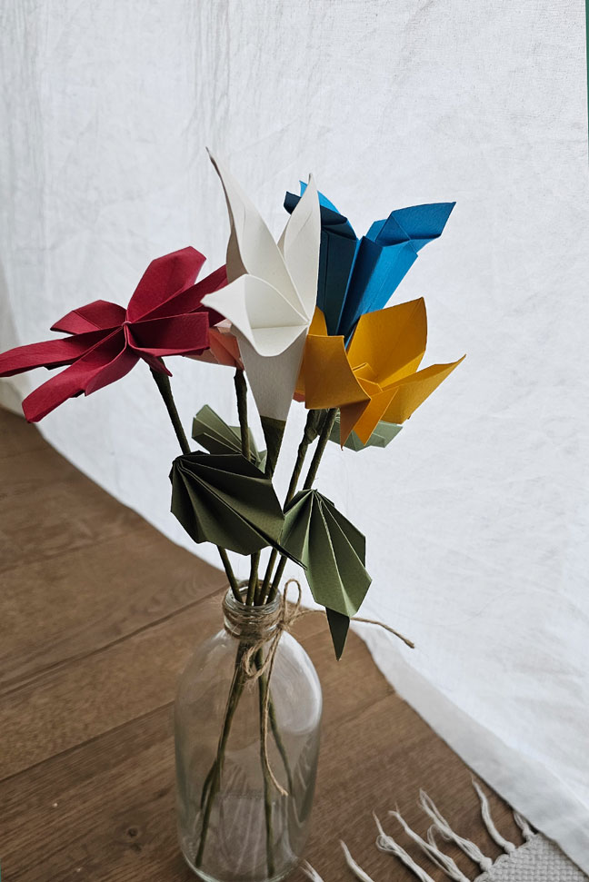 כל הזרים זהים בגודלם ובהם 5 פרחי אוריגמי ועל 3 מהם עלה ירוק  – לכם רק נשאר לבחור את הצבעוניות.