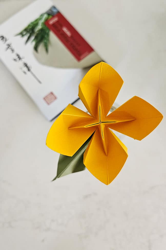 פרח אוריגמי מעוצב על הגבעול בתוספת עלה אוריגמי להוספת נפח וצבע.
